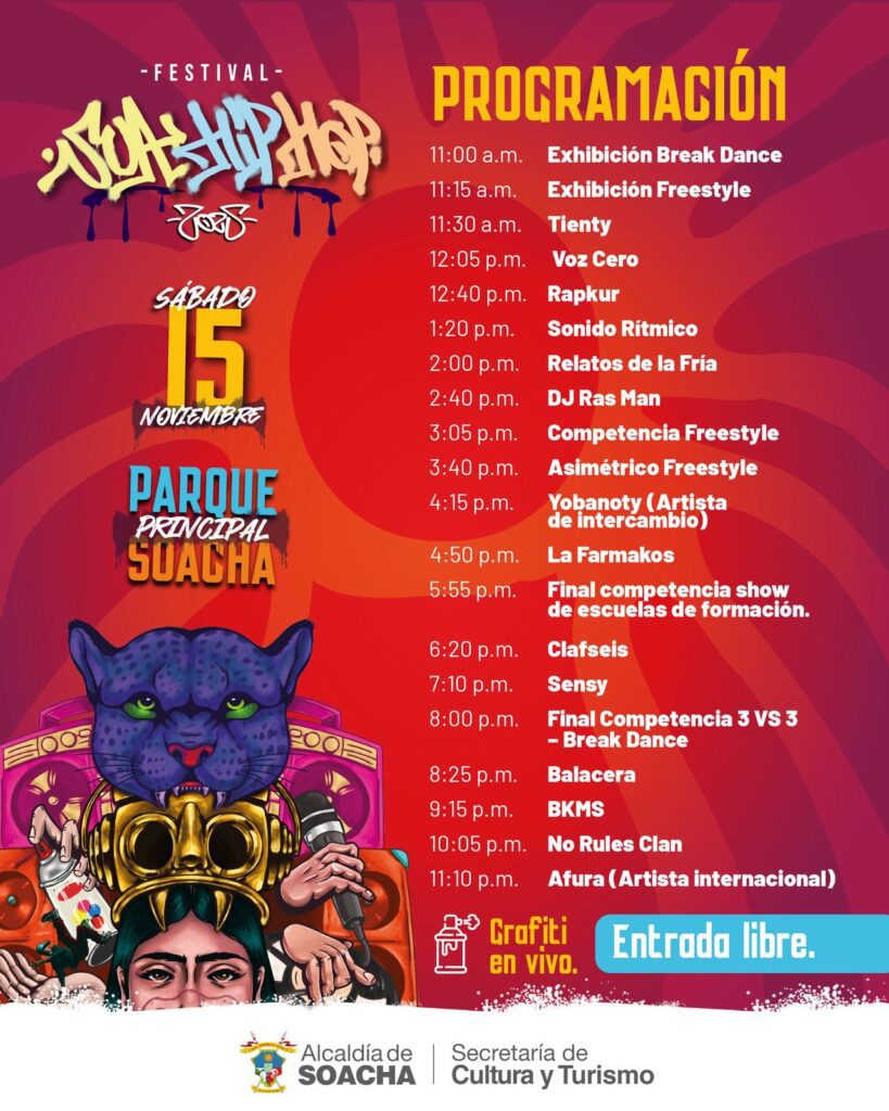 El festival abrirá sus puertas a partir de las 11:00 a.m. en el Parque Principal de Soacha, con ingreso libre para mayores de 14 años, quienes deberán asistir acompañados de un adulto responsable.